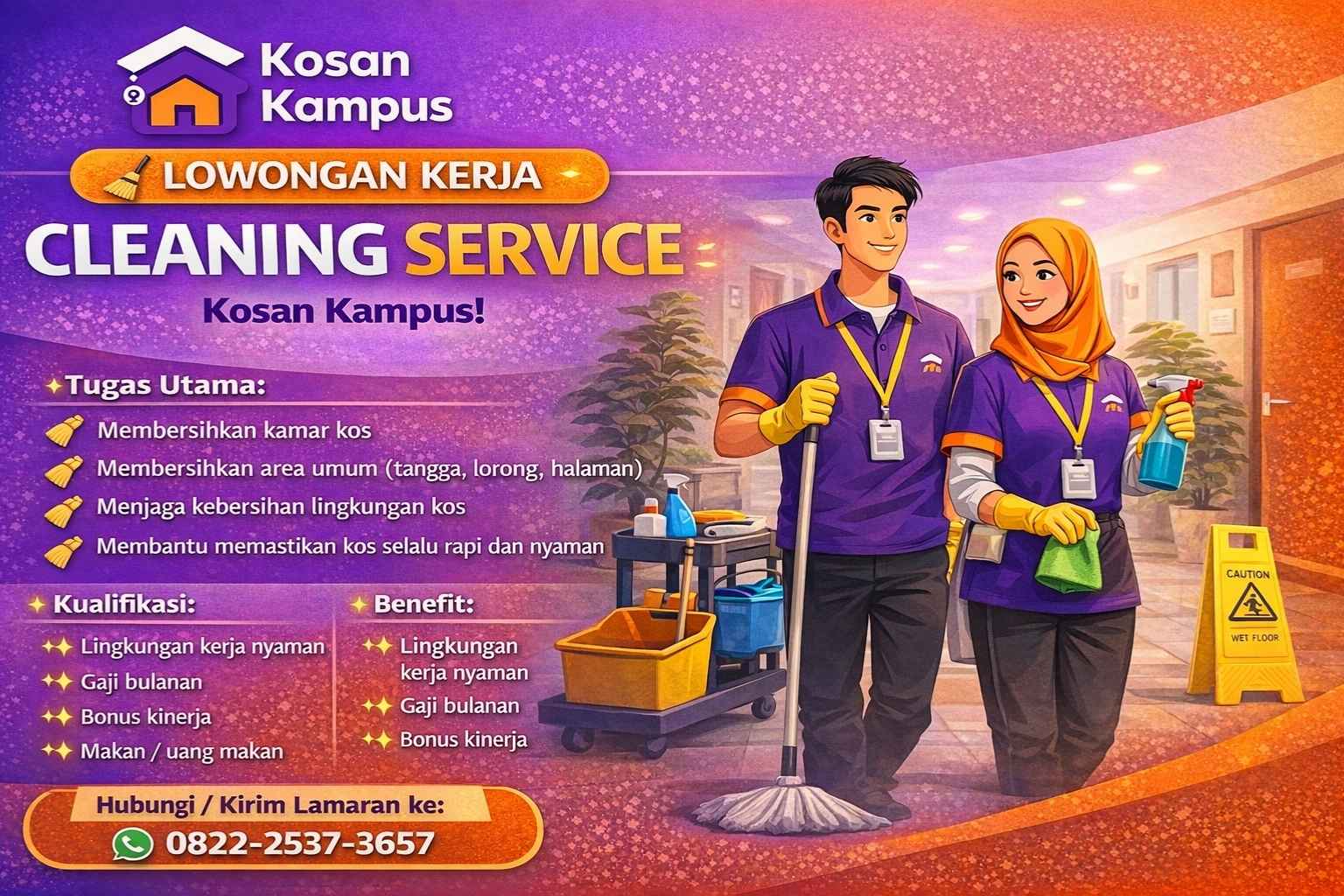 Kosan Kampus membuka kesempatan bagi Anda yang rajin, jujur, dan bertanggung jawab untuk bergabung menjadi bagian dari tim kami sebagai Cleaning Service.